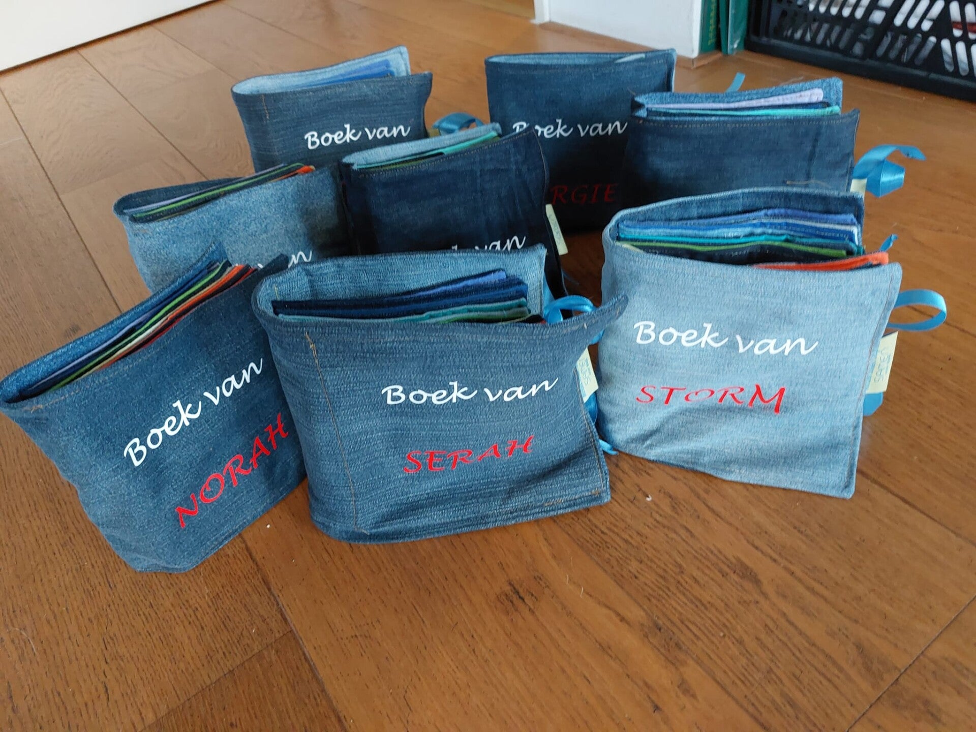 Een boekje van spijkerstof en regenboogpagina's.